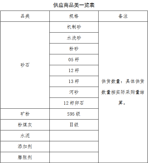 本次征集活動(dòng)為2025年度第二次原材料供應商的征集,征集供應商品類(lèi)為:砂石、水泥、粉煤灰、礦粉、膨脹劑、減水劑、外加劑等,現每年總需求約200萬(wàn)噸。